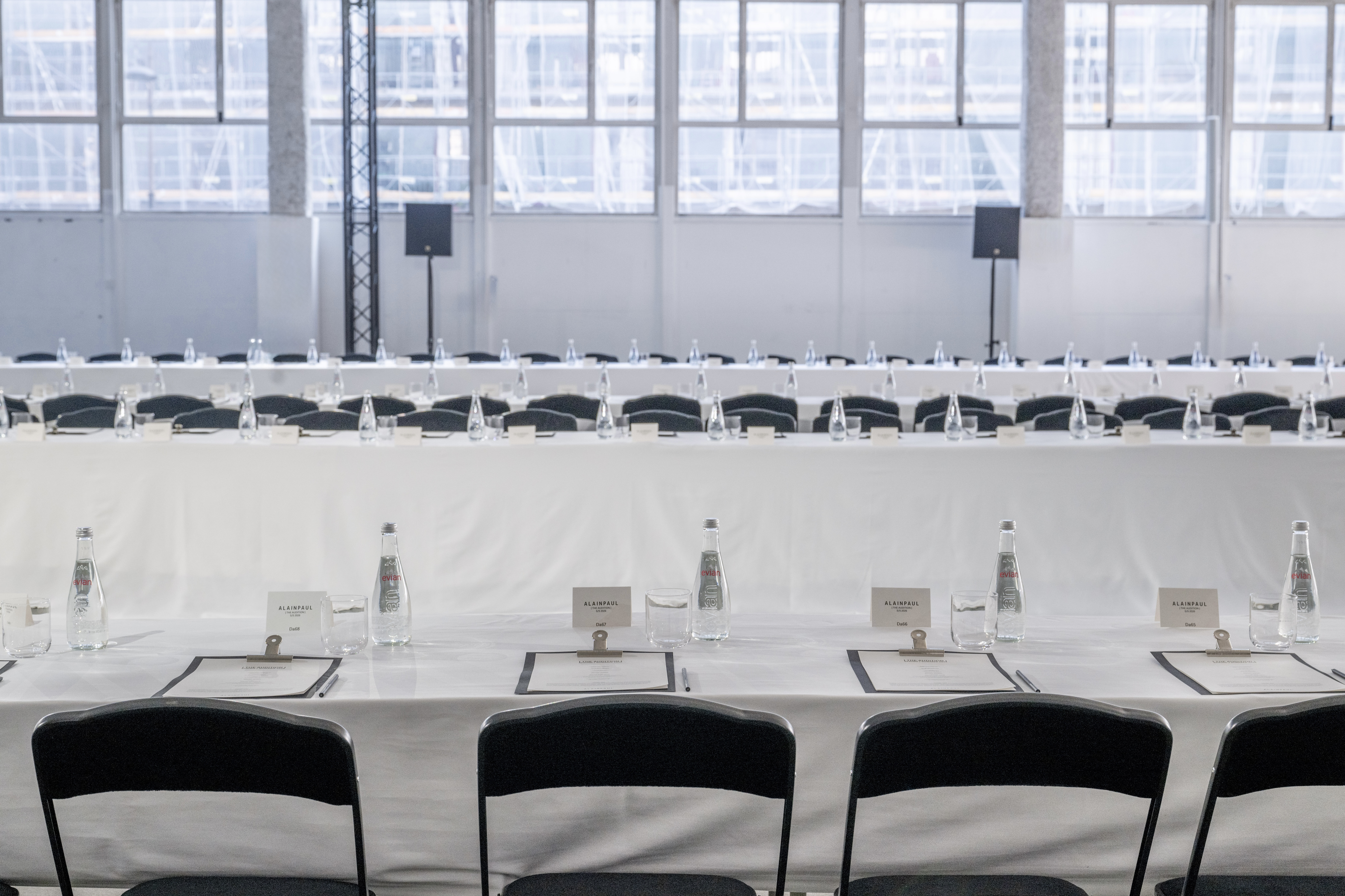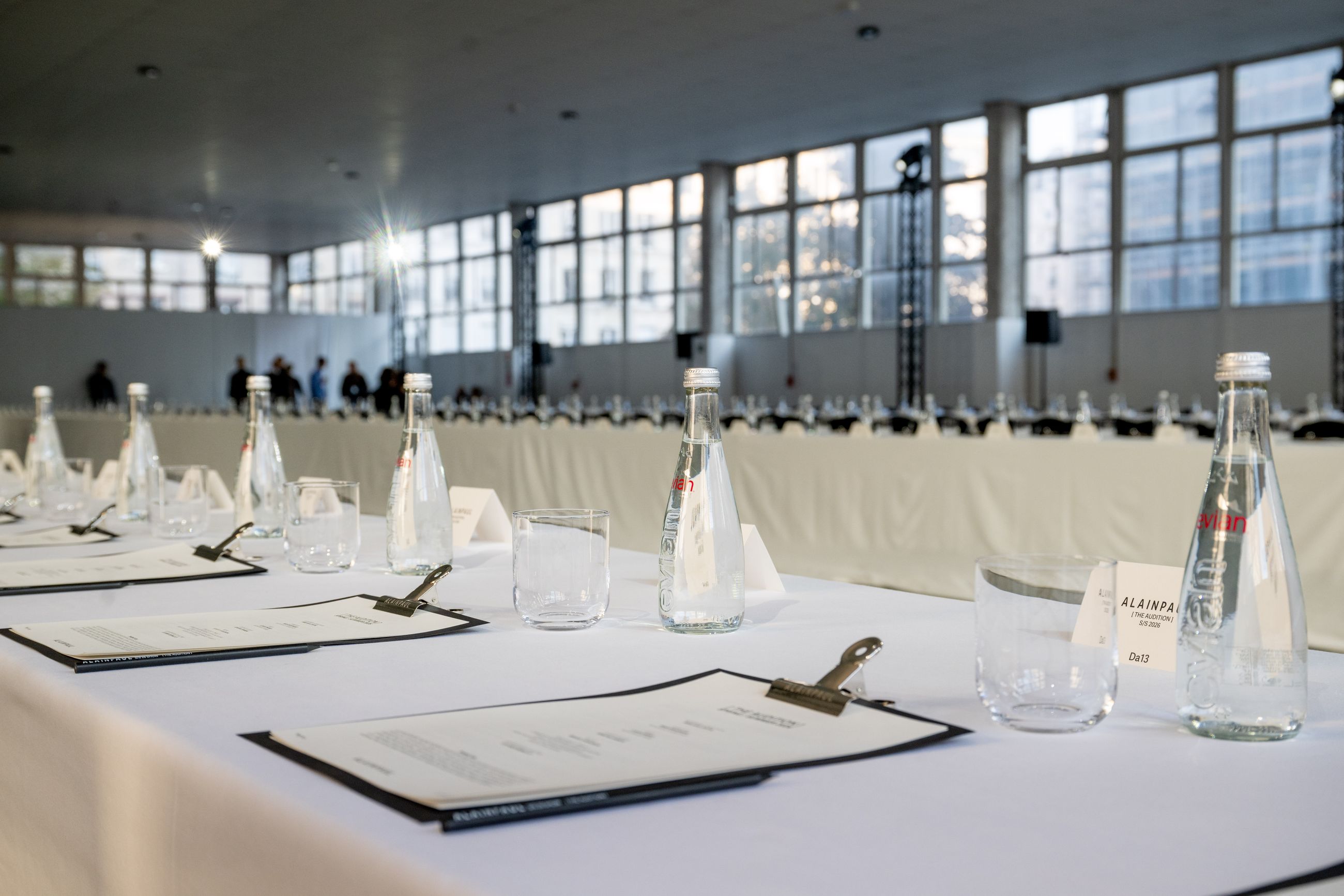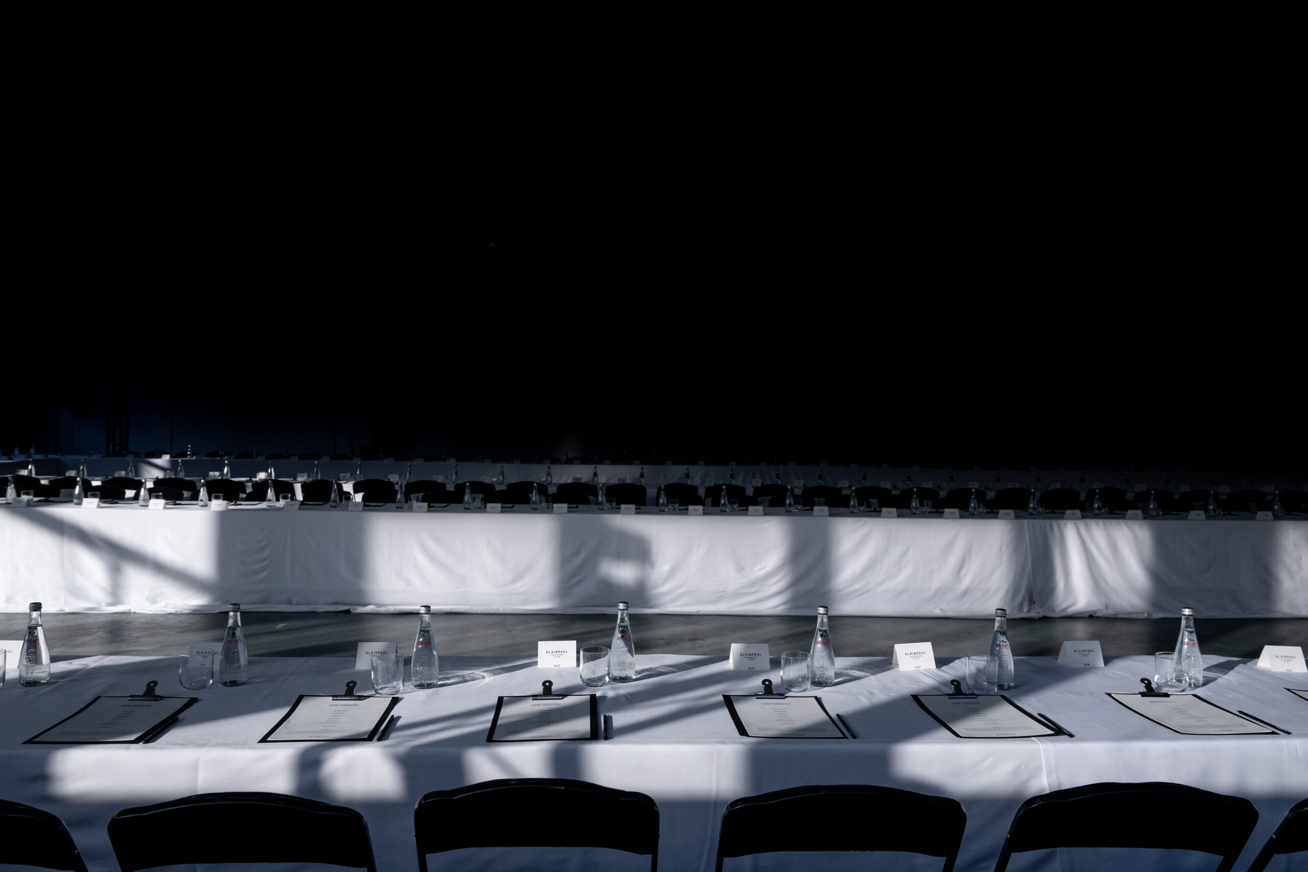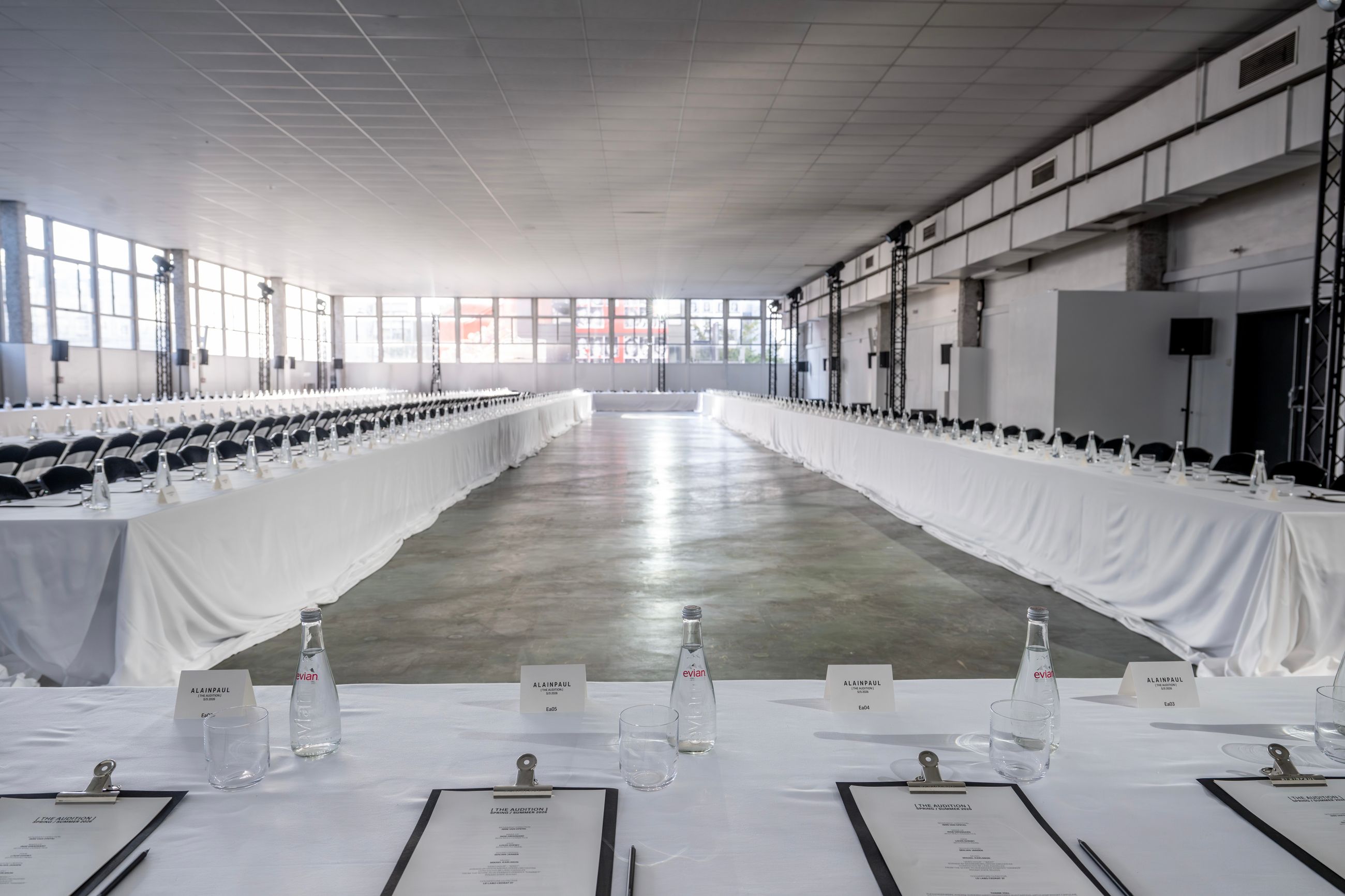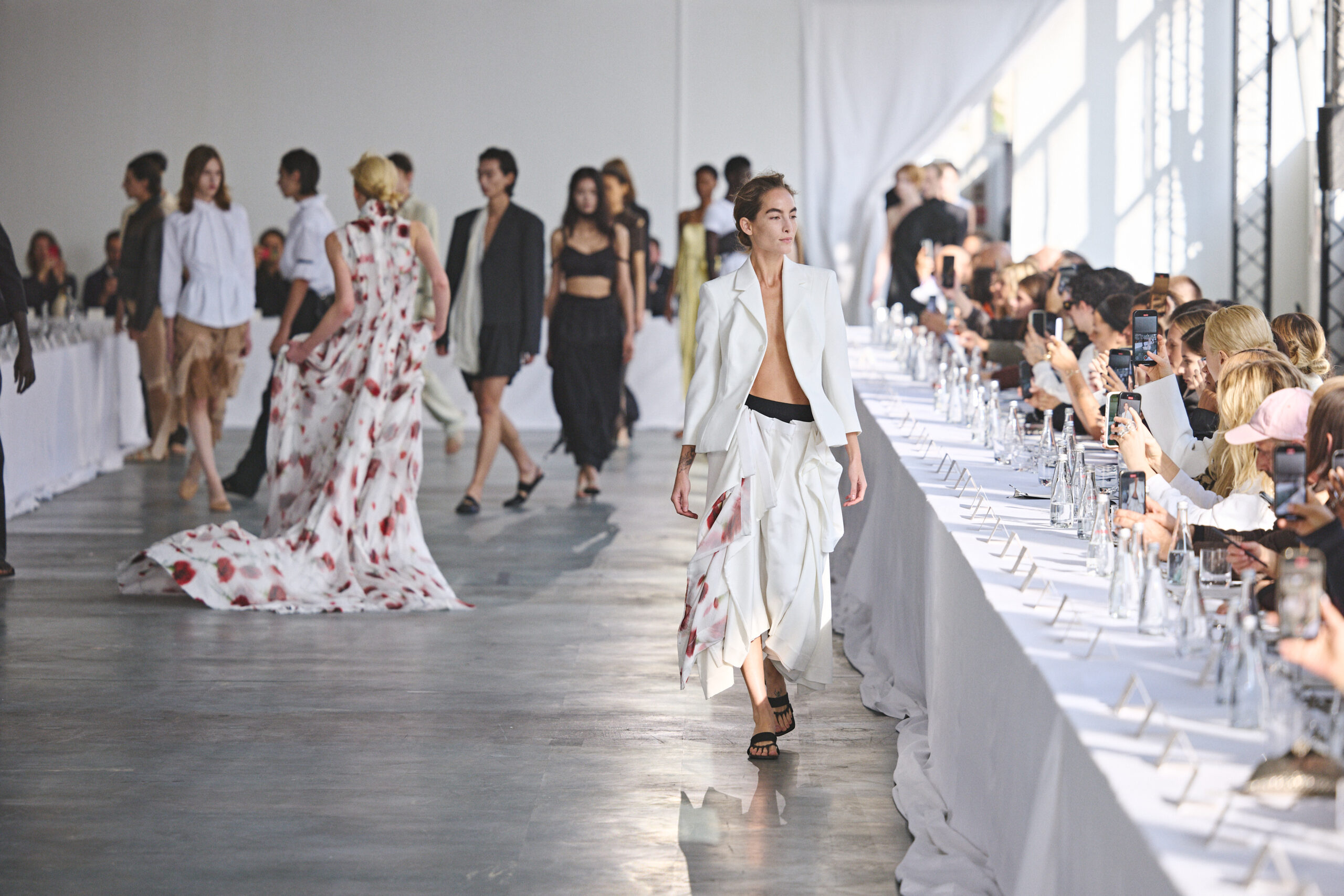 The Spring Summer 26 show unfolded in a stark audition room lined with white-clothed tables, transforming the set into a stage for quiet tension and anticipation. The minimalist design stripped away distraction, framing the models like performers in rehearsal—an exploration of presence, vulnerability, and control.