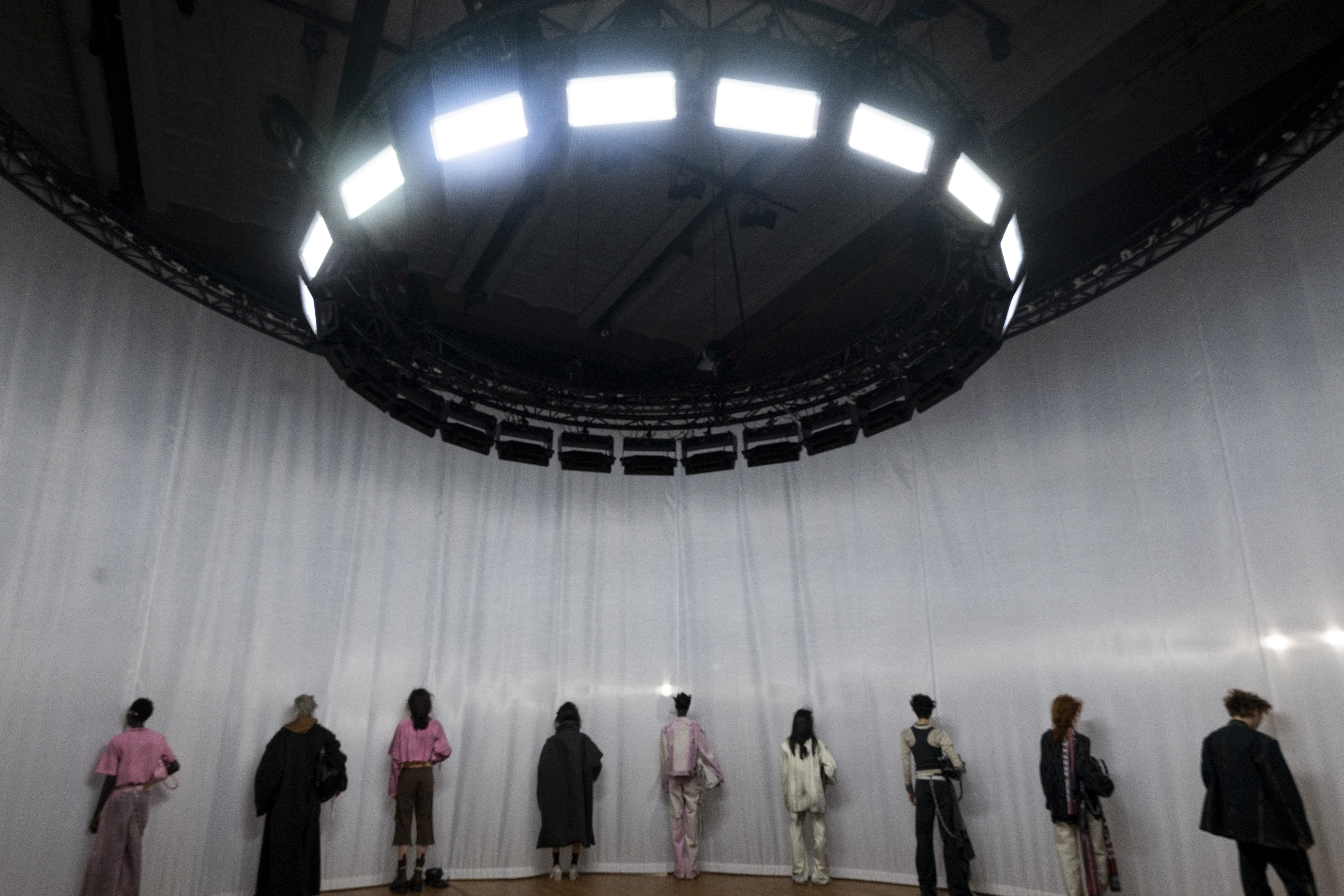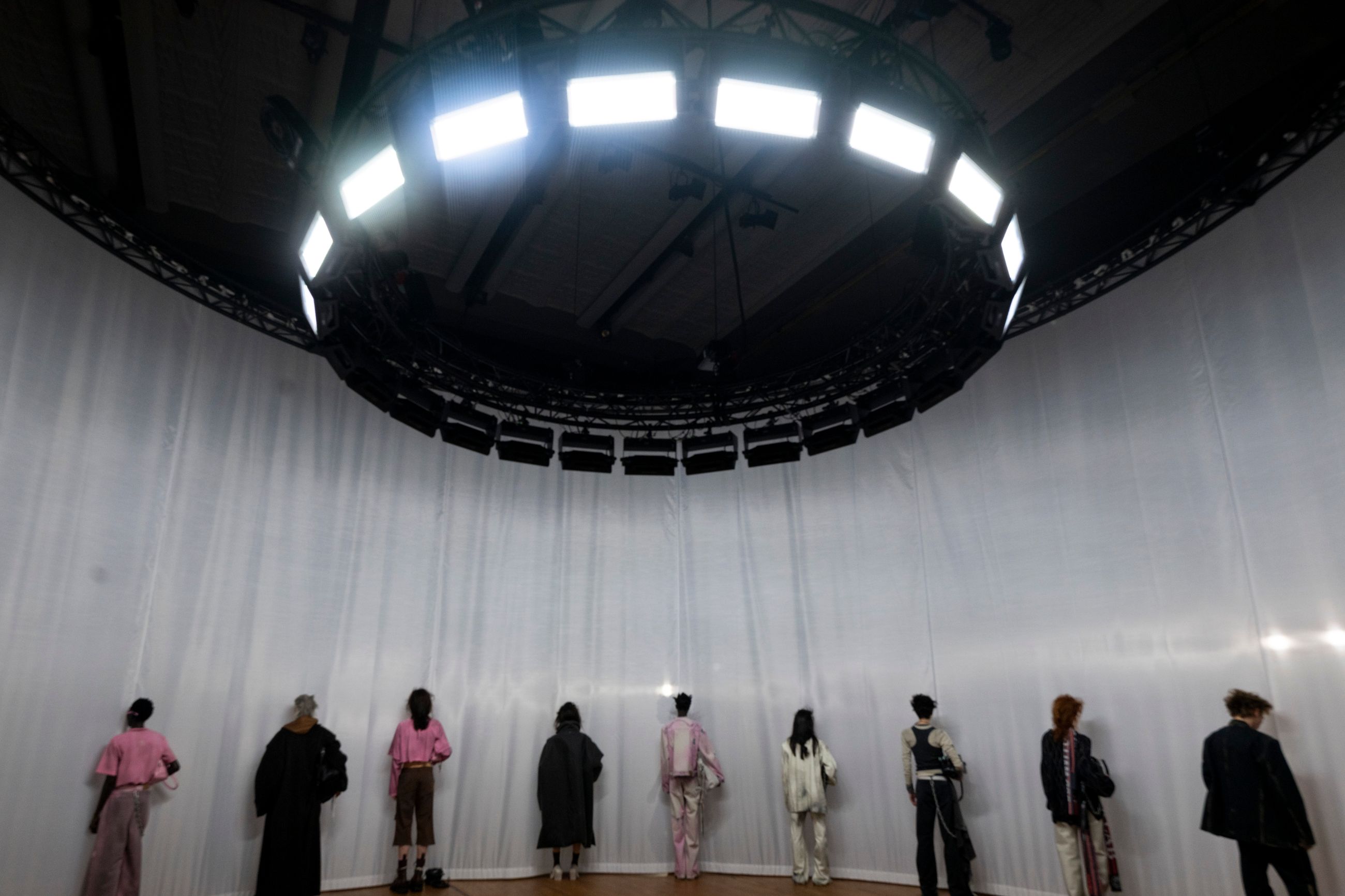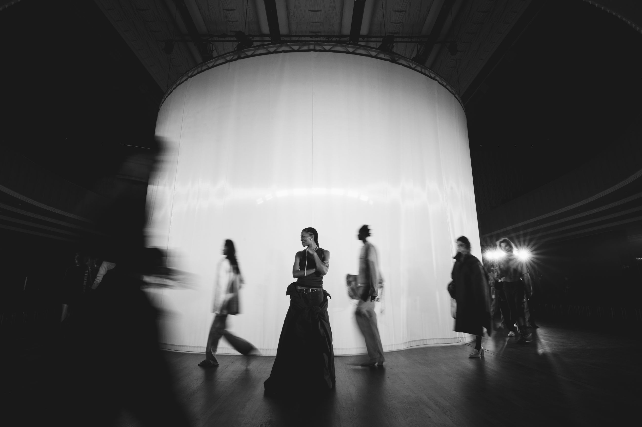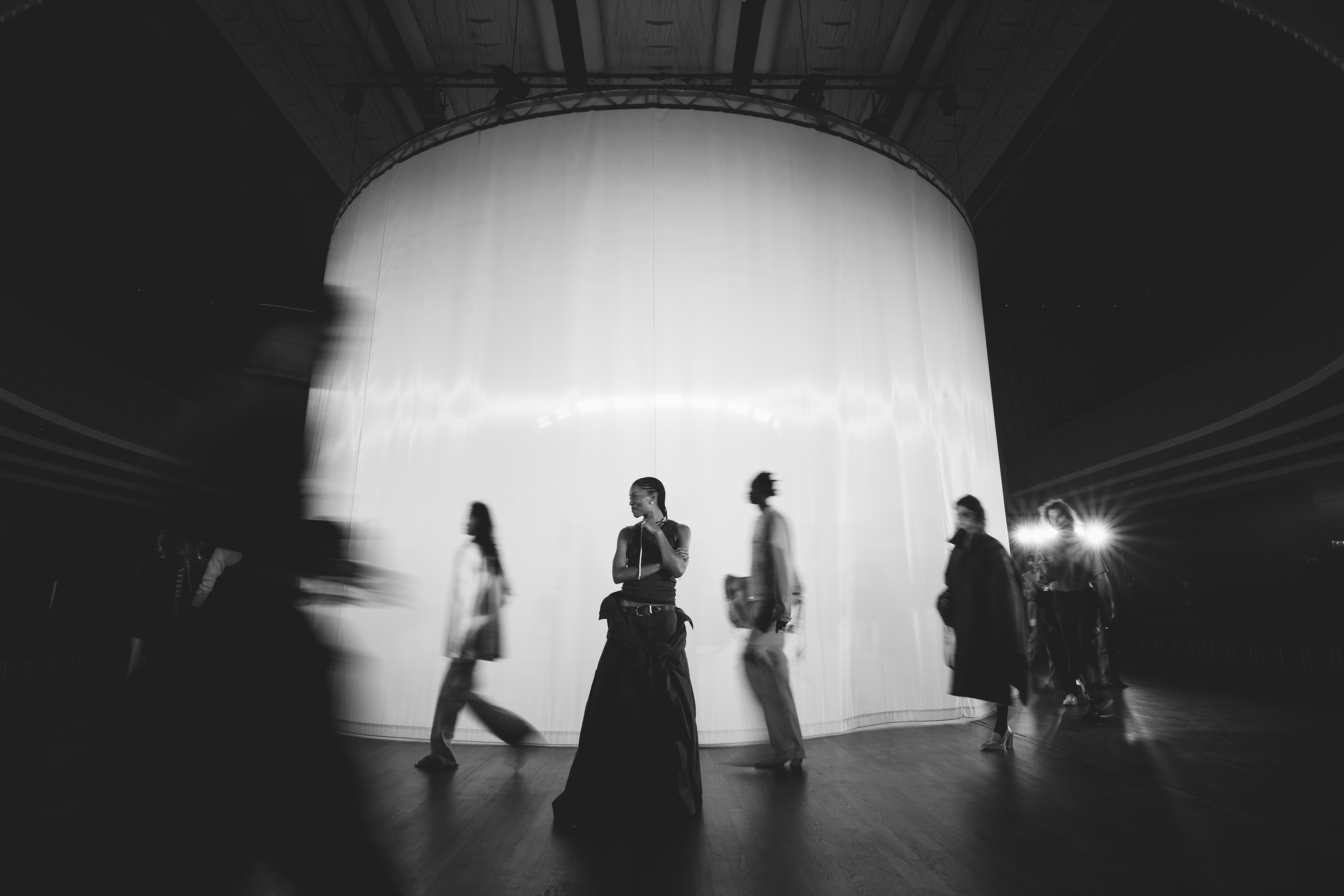 Centered around a hundred-foot-tall circular curtain, hovering above raw wood flooring, the stage set a balance of beauty and roughness that permeated the collection. The Finnish designer wanted to evoke a harsh, snow-blanketed landscape, where isolation contrasts with clarity and beauty. Some moments read as apocalyptic.