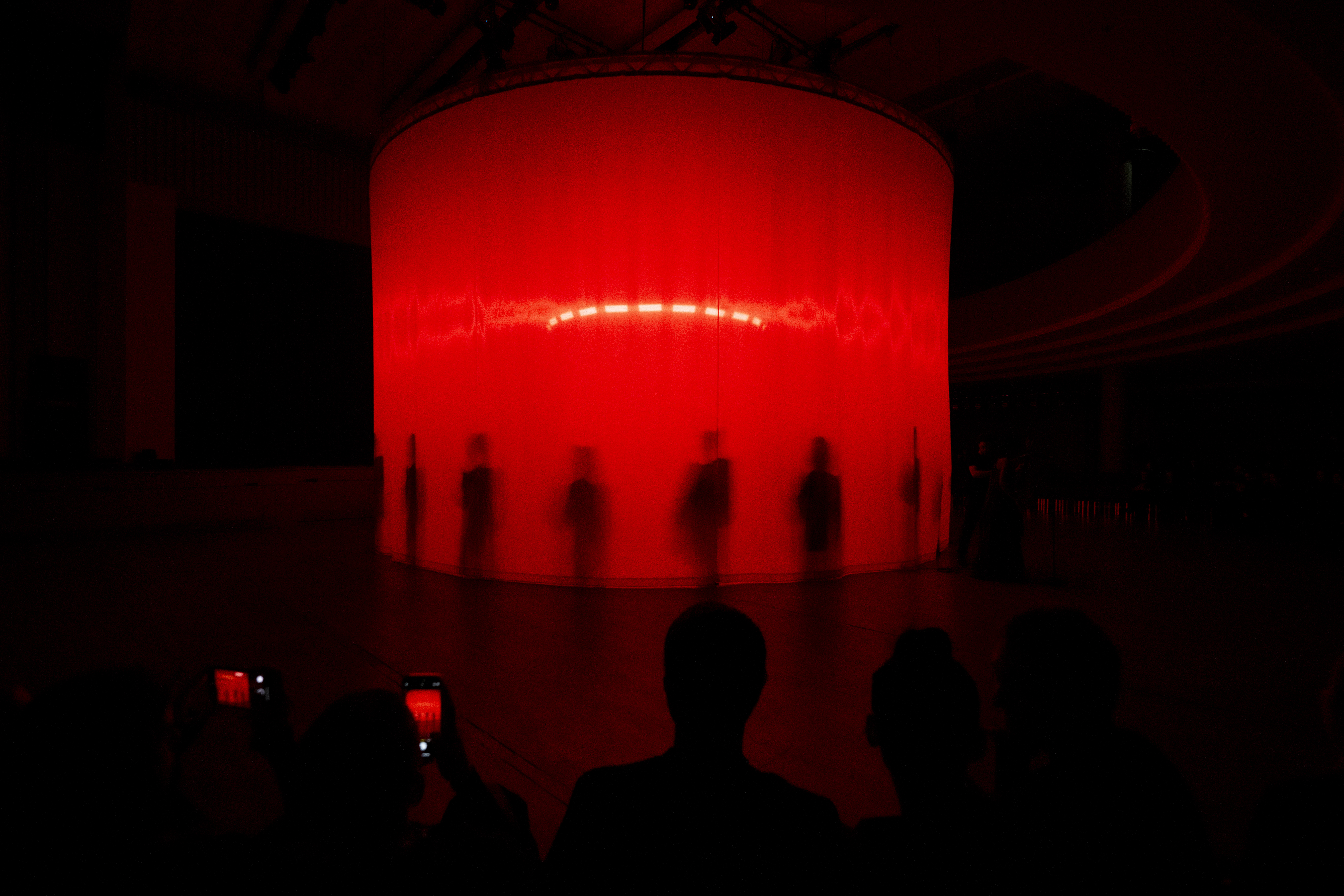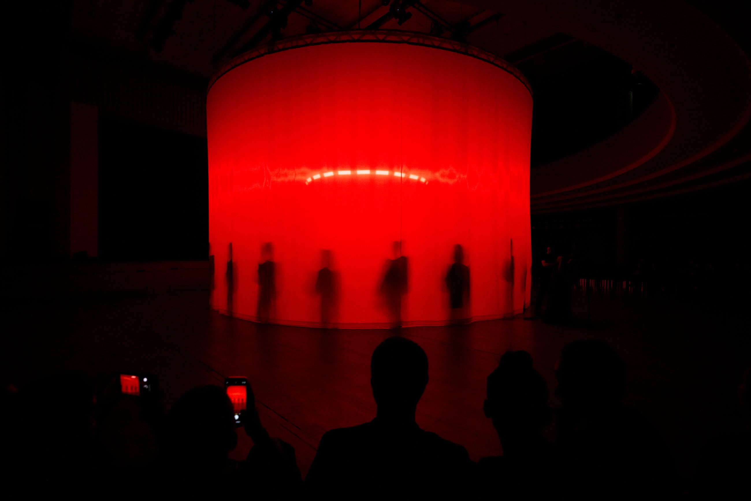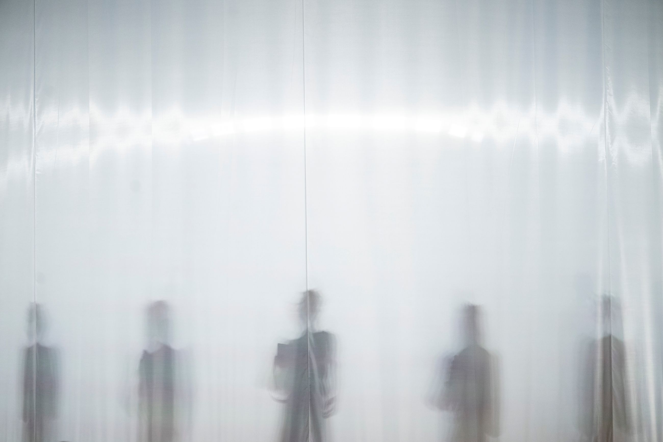 Centered around a hundred-foot-tall circular curtain, hovering above raw wood flooring, the stage set a balance of beauty and roughness that permeated the collection. The Finnish designer wanted to evoke a harsh, snow-blanketed landscape, where isolation contrasts with clarity and beauty. Some moments read as apocalyptic.