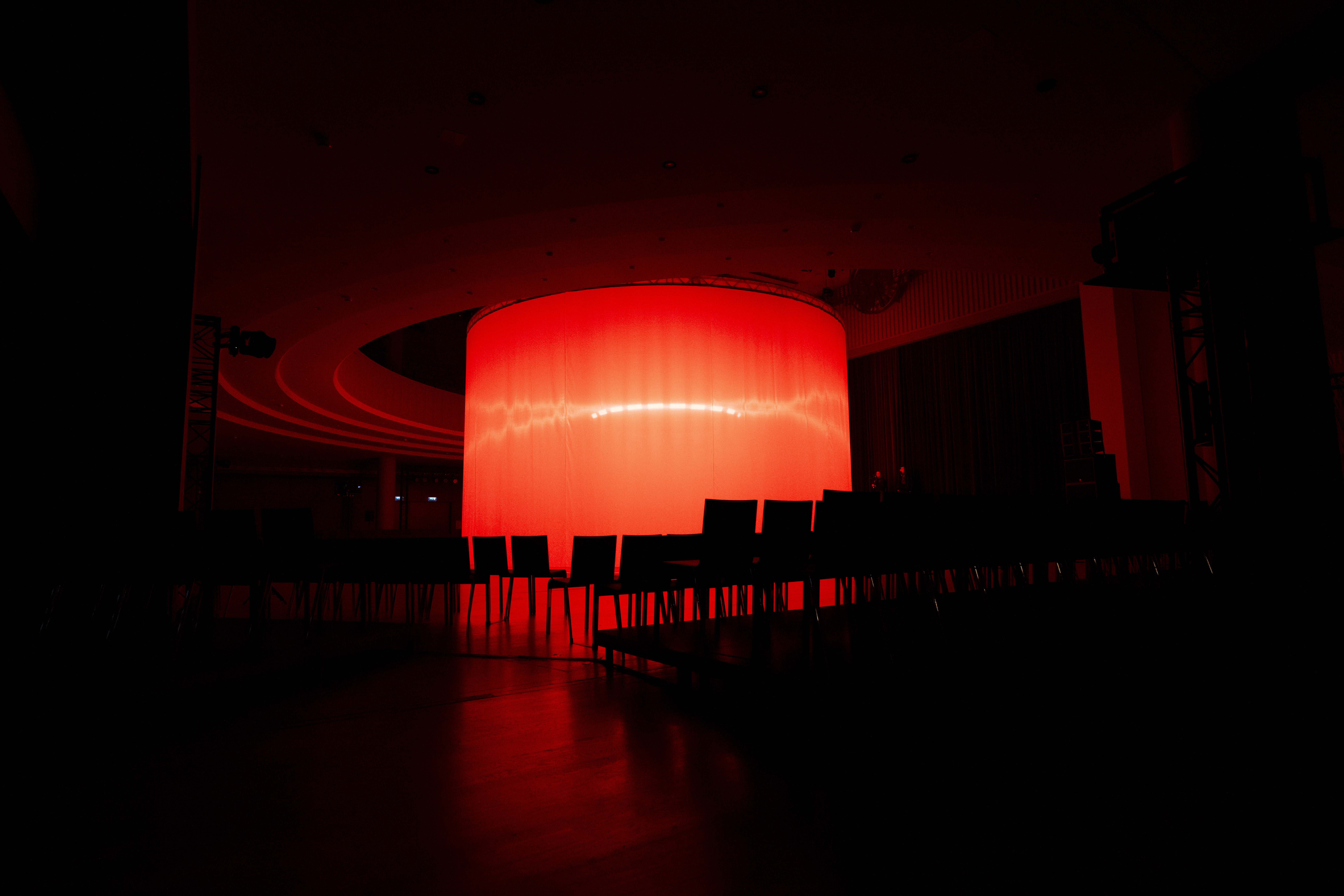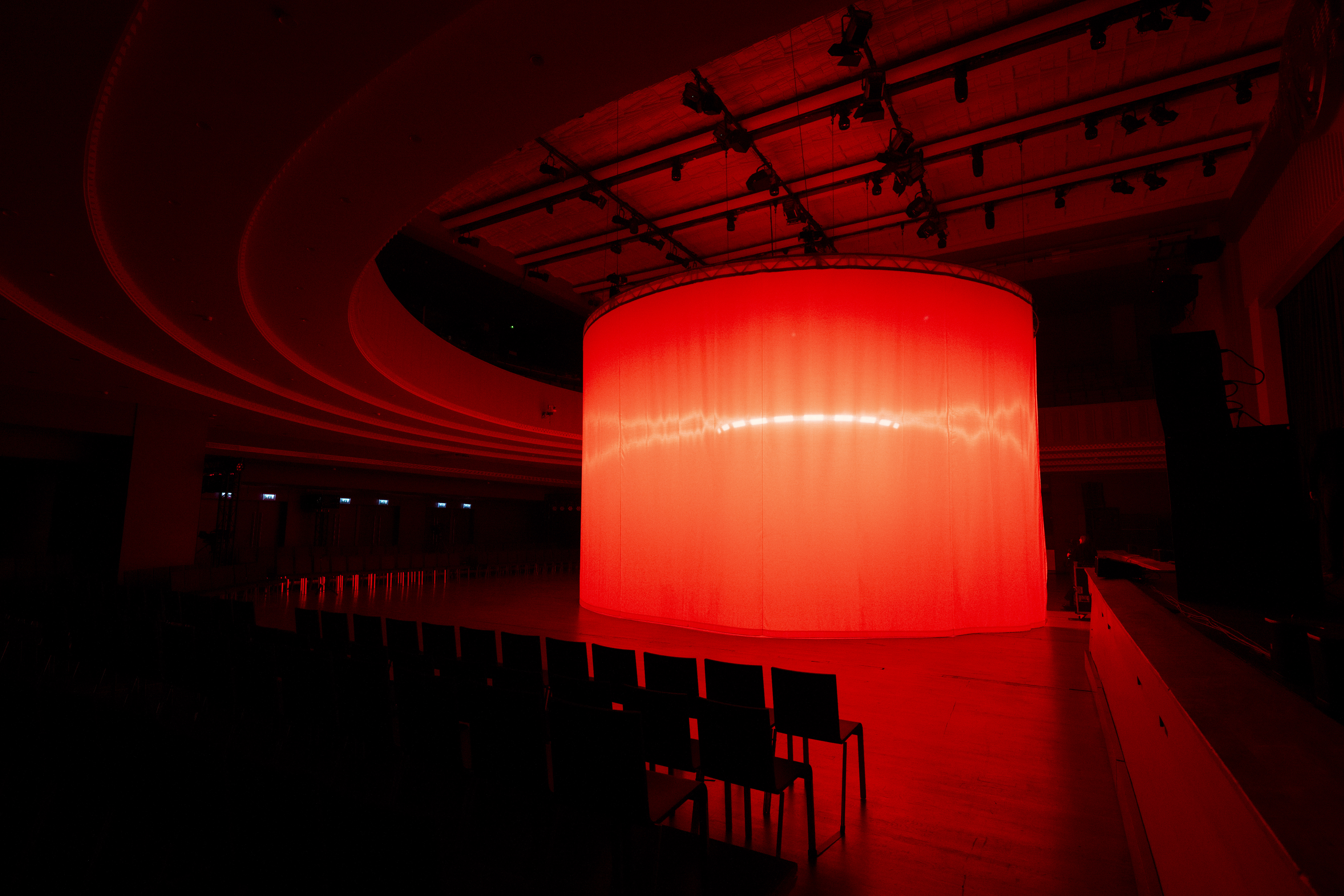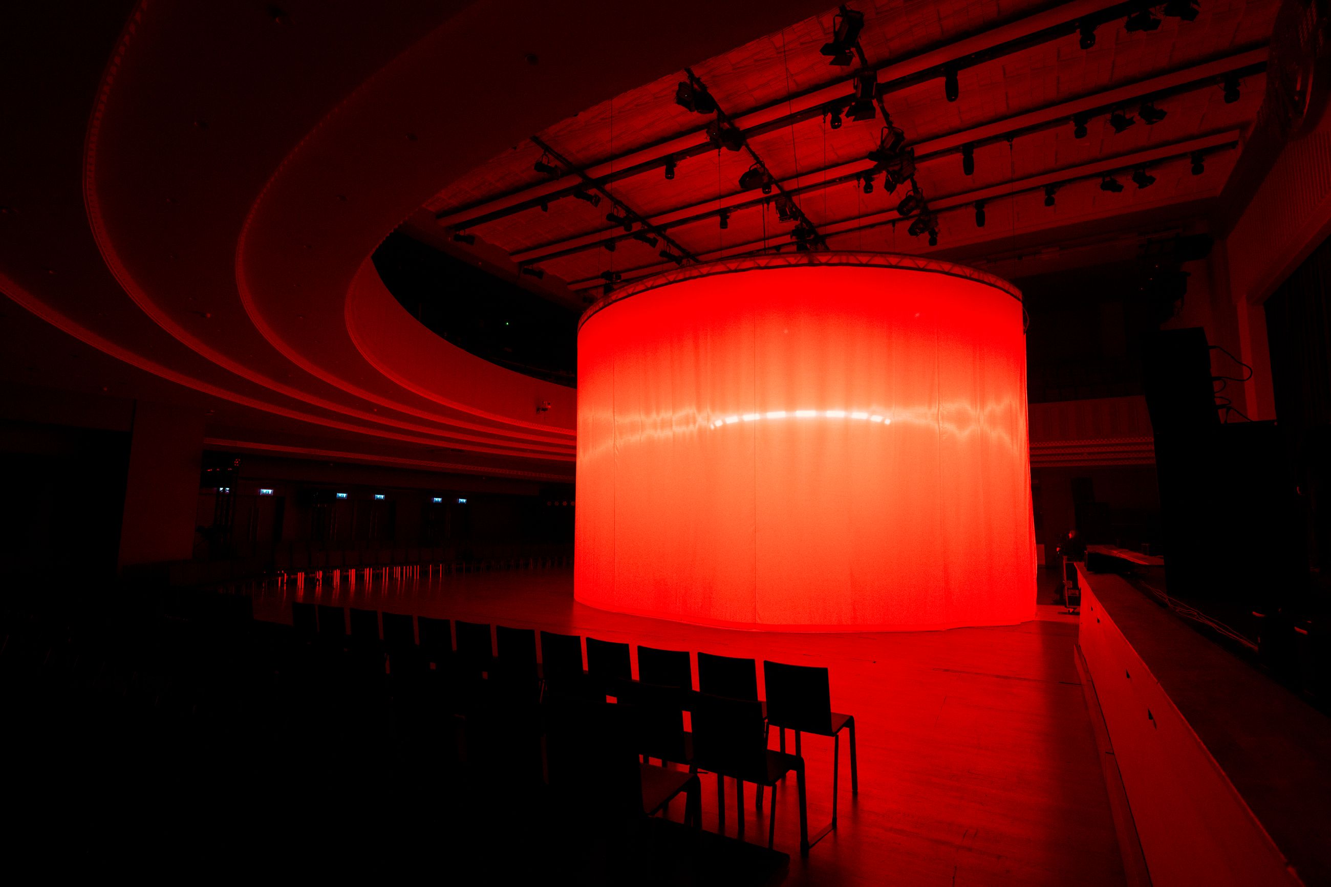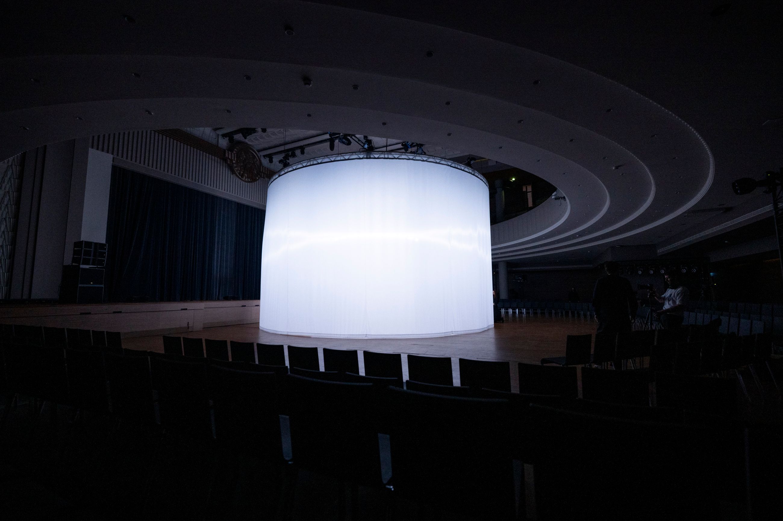 Centered around a hundred-foot-tall circular curtain, hovering above raw wood flooring, the stage set a balance of beauty and roughness that permeated the collection. The Finnish designer wanted to evoke a harsh, snow-blanketed landscape, where isolation contrasts with clarity and beauty. Some moments read as apocalyptic.