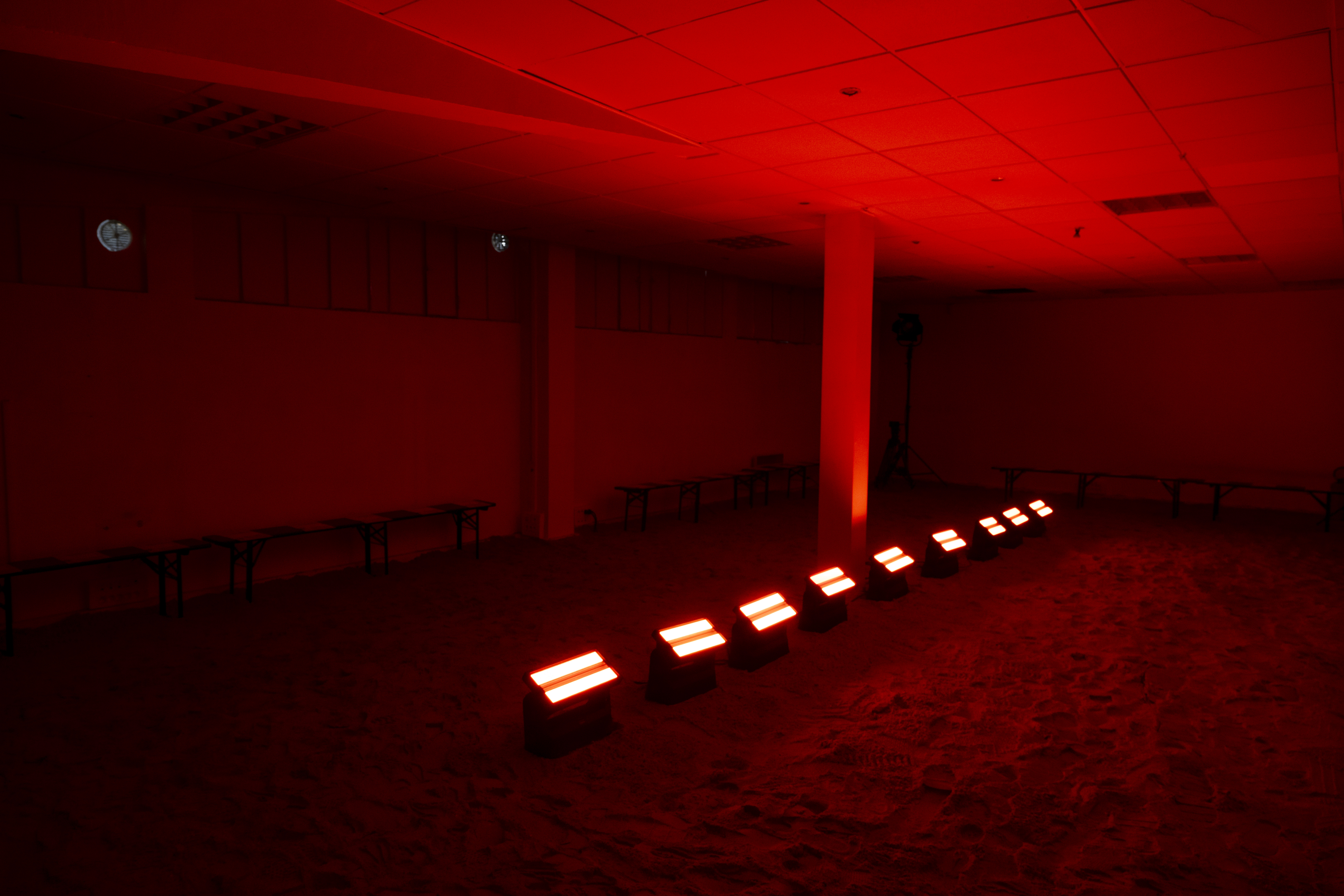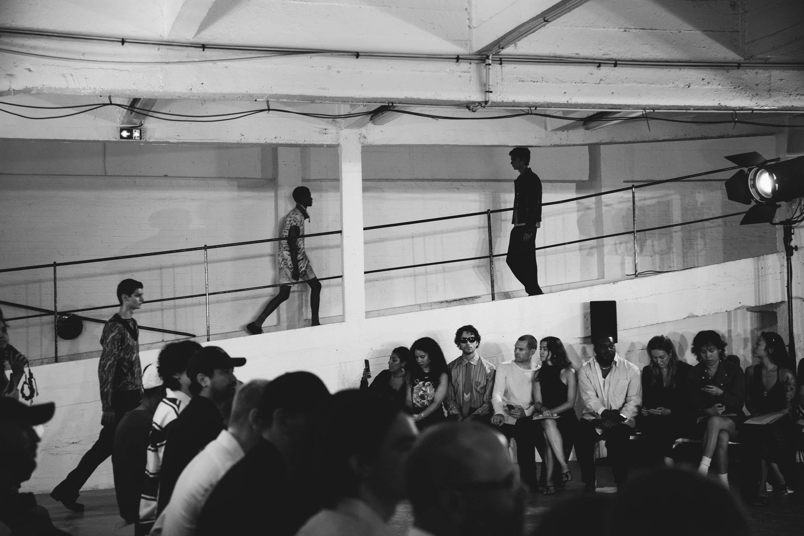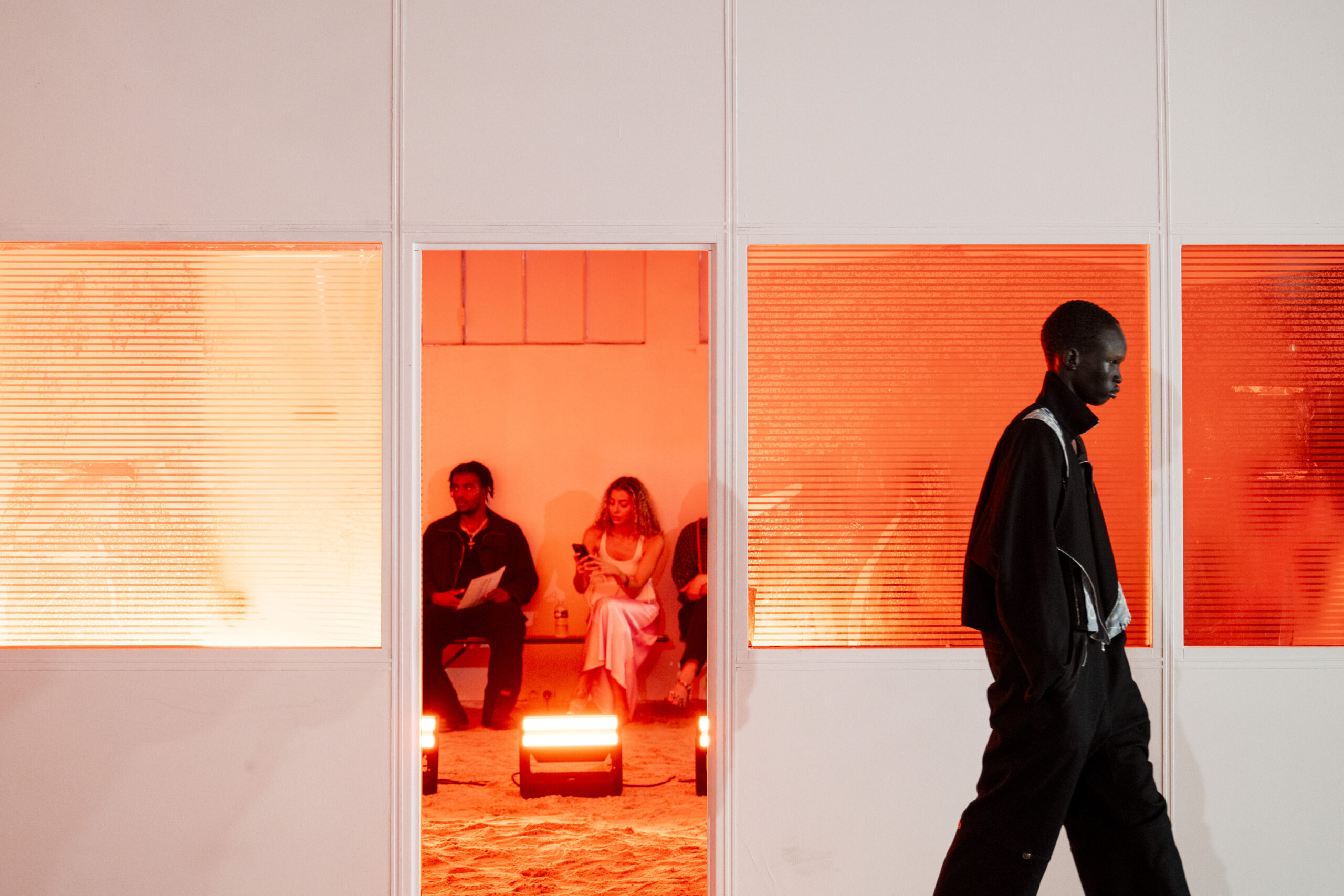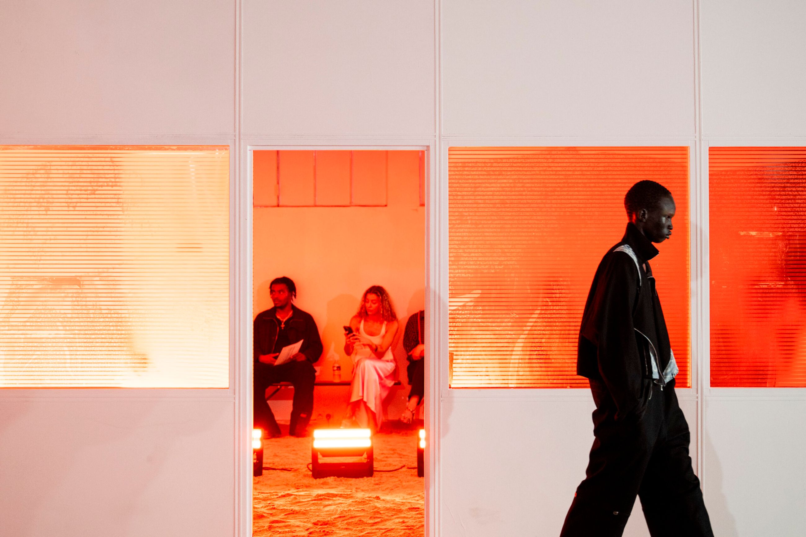 The show space traced a single day on a secluded, imagined island - its sandy floor and horizon-line lighting design evoking a quiet, elemental landscape. As light shifted from a sunrise to sunset, the entire space moved with it, immersing the collection in a continuous temporal drift.